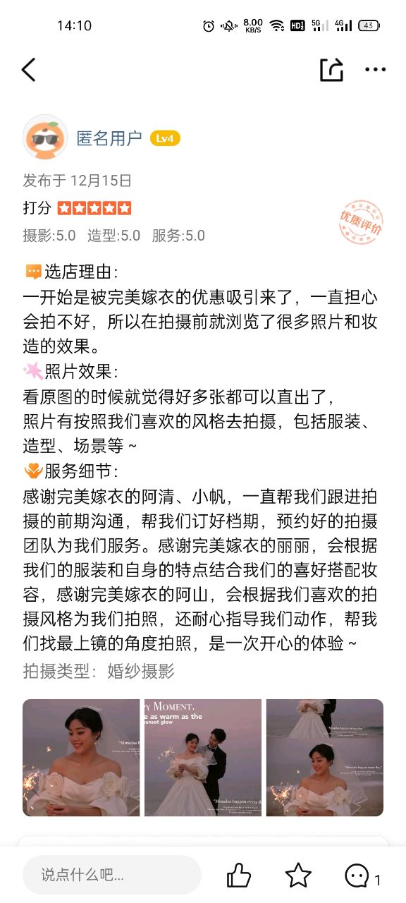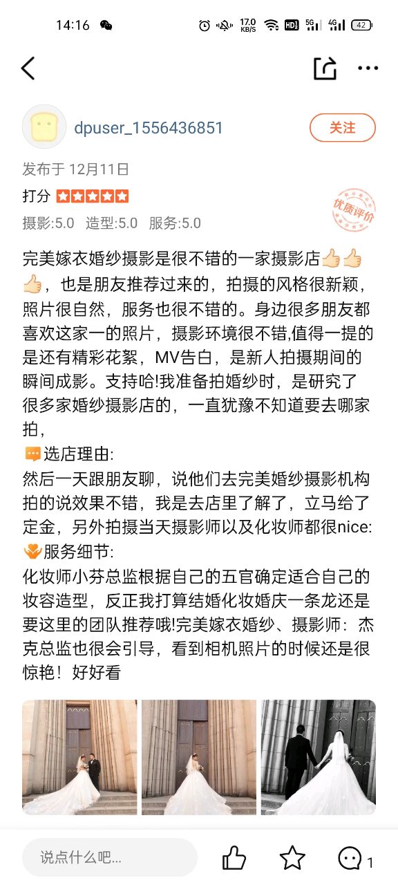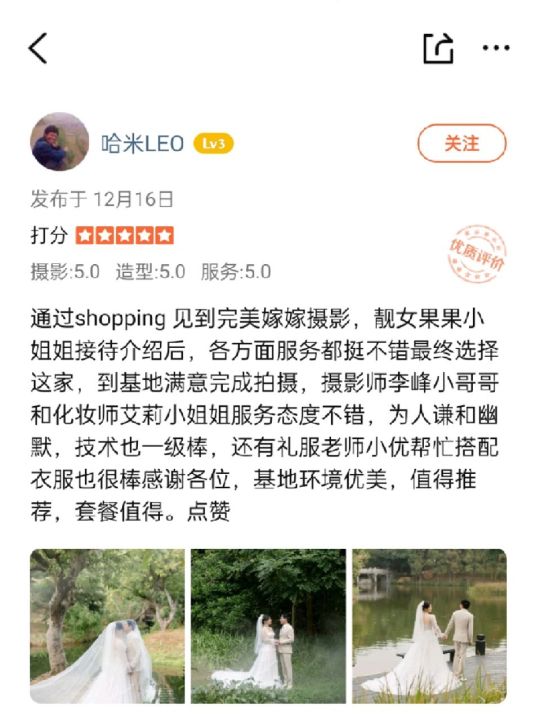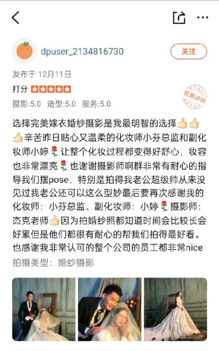 [理由]选店理由:一开始是被完美嫁衣的优惠吸引来了,...