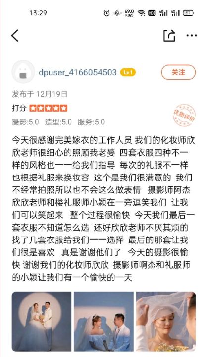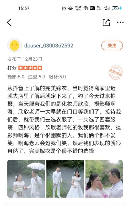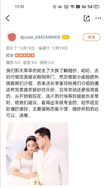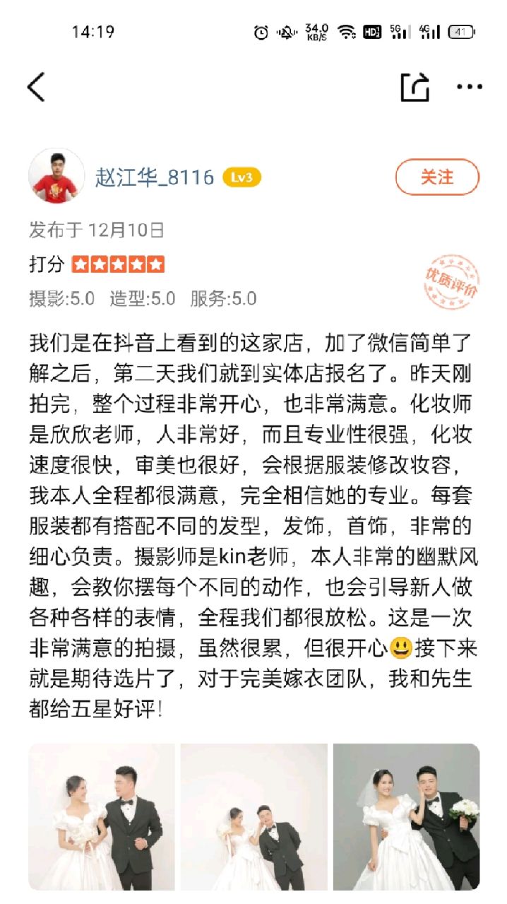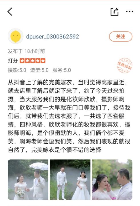 抖音上了解的完美嫁衣,当时觉得离家里近,就去店里了解...